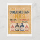 Esta postal es una reproducción de un anuncio de época para los tintes colombianos de Harrison en rojo, azul, negro y escarlata.