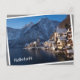 Foto postal de la ciudad de Hallstatt cubierta de nieve en la orilla del lago de Hallstätter Ver lago con montañas de los Alpes en el fondo a la primera luz del amanecer en un paisaje invernal en Austria con un borde blanco y en blanco el texto 'Hallstatt'. La imagen está un poco rotada para crear la ilusión de que se suelta.