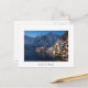 Foto postal de la ciudad de Hallstatt cubierta de nieve en la orilla del lago de Hallstätter Ver lago con montañas de los Alpes en el fondo a la primera luz del amanecer en un paisaje invernal en Austria con una frontera blanca y el texto 'Austria'.