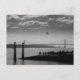 Fotografía blanco y negro clásica de puente colgante que estira hacia fuera sobre un río tranquilo que relucir.