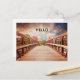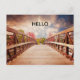 Una postal de hola con un pintoresco puente de madera que conduce a un sendero rodeado de árboles del bosque que cambian de color.