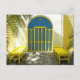 Una atractiva entrada acentuada por bancos amarillos y una bonita puerta azul.