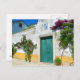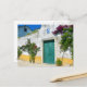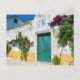 Puerta de madera verde color agua con flores de colores en flor en un pueblo mediterráneo