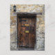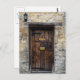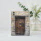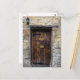 Postal de una antigua puerta de madera en una fachada de piedra de una casa con luz sobre la entrada.