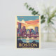 A cualquiera le encantaría recibir esta tarjeta postal de viaje con un ilustracion retro del horizonte de la ciudad y veleros en el puerto de Boston, Massachusetts.