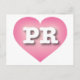 Esta postal tiene un corazón tranquilo, fresco y rosado con un centro encalado que contiene las letras negrita, blanca y alta del funda PR, la abreviatura oficial de Puerto Rico, la isla encantada. El reverso de la postal está en blanco, esperando el texto personalizado o los sentimientos manuscritos.