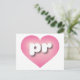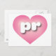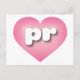 Esta postal presenta un corazón rosado con un centro lavado de blanco que contiene letras negrita, redondeadas de funda inferior, una versión juguetona de la abreviatura de Puerto Rico, la isla encantada. El lado inverso de la postal está en blanco, esperando tus sentimientos escritos a mano o texto personalizado.