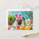 pug dressed as an Easter Bunny among colorful Easter eggs, adding a festive touch.