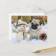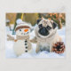 pug sitting beside a snowman in a winter setting, capturing playful interaction in the snow.