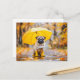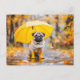 pug wearing a raincoat, umbrella, and rubber boots in autumn rain, looking adorable in rainy weather.