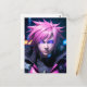 Una pintura digital distópica ciberpunk vívida y atractiva de un punk de la calle de cabello rosa brillando con cibernetica interna. Un cyberpunk y una imagen de fantasía final perfecta para los aficionados a la distopía de alta tecnología, a la ciencia ficción y a las historias futuristas ambientadas en videojuegos, cómics y obras de arte. Presentando una vívida y animada representación de una distópica ciudad de ciberpunk por la noche, mientras un solitario punk callejero con un realce cibernético recorre las calles en busca de su próxima víctima.