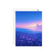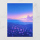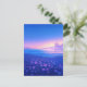 This ethereal postcard captures a magical twilight transition over a coastal meadow. The foreground is filled with a lush carpet of purple and blue wildflowers, their yellow centers glowing softly against the deep blue grass. The scene opens up to a calm, shimmering ocean under a vibrant sky that gradients from a warm golden-pink horizon into a deep, star-studded azure. Wispy purple clouds catch the last light of day, creating a dreamlike and serene atmosphere. This postcard is a beautiful choice for sending a peaceful greeting, a nature-inspired note, or a heartfelt message to anyone who loves the seaside at dusk.