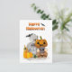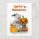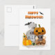 Un niño de la cabeza de calabaza de Halloween sentado junto a la tumba.