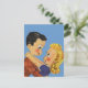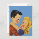 Un personalizado de una pareja de la cosecha justo antes de besarse. Lleva puesto un traje y ella tiene un delantal sobre su vestido. Fondo azul