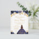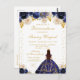 Esta tarjeta de cumpleaños de Quinceañera elegante y glamurosa presenta a una bella princesa con pelo oscuro en una tiara y traje de baile azul marino. El texto combina escritura a mano y tipografías modernas sans serif para una apariencia clásica y sofisticada. Las composiciones florales y el confeti dorado crean la mezcla perfecta de rústico y elegante.