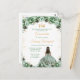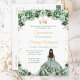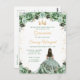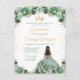 Esta elegante y glamurosa invitación de cumpleaños para Quinceañera presenta a una hermosa princesa con cabello oscuro en un vestido de baile de color verde menta. El texto combina letra manuscrita y fuentes modernas sans serif para un look clásico y sofisticado. Los arreglos florales y el confeti dorado crean la combinación perfecta de rústico y chic.