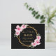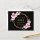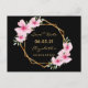 A Guardar la tarjeta de fecha para una fiesta tropical temática de Quinceañera, 15º cumpleaños. Delante: estilo tropical de moda. Con un marco geométrico falso dorado decorado con hibiscos rosas, flores tropicales con algo de vegetación. Un fondo negro de moda. Plantillas para un nombre y una fecha. Cartas doradas. El nombre y el texto: Guardar la fecha se escriben con un guión de estilo con letras a mano moderno. Atrás: sin fondo, letras negras. Esta tarjeta también está disponible en nuestra tienda con un color de fondo negro en la parte posterior.