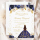 Esta elegante y glamurosa invitación de cumpleaños de Quinceañera presenta a una hermosa princesa con cabello oscuro en una tiara y vestido de gala azul marino. El texto combina letra manuscrita y fuentes modernas sans serif para un look clásico y sofisticado. Los arreglos florales y el confeti dorado crean la mezcla perfecta de rústico y chic.