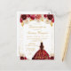 Esta elegante y glamurosa invitación de cumpleaños de Quinceañera presenta a una hermosa princesa con cabello oscuro en una tiara y vestido de baile rojo. El texto combina escritura a mano y fuentes modernas sans serif para un look clásico y sofisticado. Los arreglos florales y el confeti dorado crean la combinación perfecta de rústico y chic.