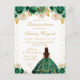 Esta elegante y glamurosa tarjeta de cumpleaños de Quinceañera presenta a una hermosa princesa con cabello oscuro en una tiara y vestido de gala verde. El texto combina letra manuscrita y fuentes modernas sans serif para un look clásico y sofisticado. Los arreglos florales y el confeti dorado crean la mezcla perfecta de rústico y chic.