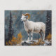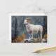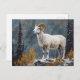 Un carnero blanco con magníficos cuernos sobre un terreno nevado rodeado de altos árboles de coníferas y un follaje vibrante, con fuerza y asombro en un entorno salvaje y invernal de montaña.