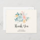 Tarjeta postal de agradecimiento, con una bonita ilustración de acuarela. Un ramo de flores con flores rosas y azules rodeadas de hojas verdes y ramitas.