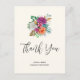 Tarjeta de agradecimiento, con un arreglo floral que contiene hermosas rosas rosadas, naranjas y blancas rodeadas de hojas verdes.
