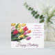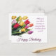 Expresa tus más cálidos deseos de cumpleaños con esta tarjeta postal de cumpleaños con un elegante ramo de tulipanes personalizable. Con un impresionante ramo de tulipanes multicolores sobre un fondo blanco simple y elegante, esta tarjeta postal te permite personalizar el texto de "Feliz Cumpleaños" y agregar tu propio saludo sincero. El diseño de buen gusto y las opciones personalizables hacen que esta tarjeta postal sea una opción perfecta para compartir tu afecto y consideración en el día especial de alguien.