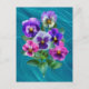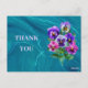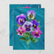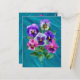 Colorido ramo de aquarela de violetas pensamientos sobre un fondo de aquarela azul teal y la inscripción GRACIAS en el reverso.