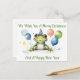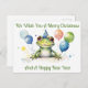Una linda rana con globo rojo, azul y rojo, sentada frente a ti, con un lindo gorra fiesta, acuarela. El texto se puede cambiar si se utiliza la herramienta de diseño/edición. Ahora dice "Te deseamos una Feliz Navidad y un feliz Año Nuevo"