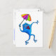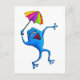Esta encantadora rana azul brillante teatral está cantando de alegría en la lluvia estival mientras baila con un paraguas colorido.