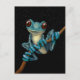 Este adorable diseño presenta una pequeña rana de árbol azul sosteniendo una delgada rama. La pequeña rana está mirando hacia adelante con la cabeza inclinada ligeramente hacia un lado, lo que le da una mirada curiosa. Los cuatro pies de la rana están envueltos alrededor de una delgada rama que se mueve desde el fondo del diseño hasta el lado derecho del patrón. Este diseño único es un lindo ejemplo de esta maravillosa criatura de la selva tropical.