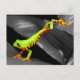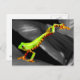 Rana acrobática de árbol verde cal con rayas naranjas y negras en el vientre, parece que está haciendo un caballete. Anfibio saltante muy colorido sobre fondo blanco y negro.