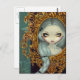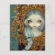 Rapunzel se muestra en una torre alta con un paisaje de campo francés silencioso detrás de ella. La ventana está imposiblemente decorada al estilo rococó, y su cabello se desliza por toda la pintura.