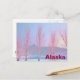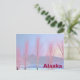 Pintura digital de abedules cubiertos de nieve; la nieve matiza el rosa por el sol abrasador. También aparece el texto "Alaska". Aquí en el norte es común ver árboles cubiertos de nieve teñidos de rosa o naranja por el sol colgando bajo en el horizonte.