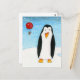 Postal con el ratón flotando en su globo de aire caliente encontrándose con un pingüino. Pintura por s t u d i o L e n a r www.studiolennart.com