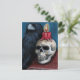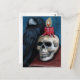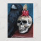 Postal de Halloween con una pintura de un cuervo negro hace guardia sobre un viejo libro de ortografía, un cráneo y una vela roja. Pintura © Lisa Marie Robinson. Todos Los Derechos Reservados.