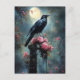 Un cuervo impresionante se alza sobre una lápida cubierta de musgo rodeada de rosales rosadas vibrantes, mientras que la luna llena ilumina la escena serena y mística.
