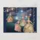 Cuatro mujeres de la moda francesa real rococó con faldas de aro bailando en un escenario de teatro con luces colgantes sobre lo alto. Magico