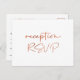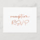 Esta sencilla pero elegante y moderna tarjeta postal de la recepción de la boda del rosa de cobre de oro RSVP incluye su cena de recepción y su moderno guión con letras a mano. Se puede utilizar junto con una tarjeta de invitación a la cena o una tarjeta de invitación/recepción del boda (se vende por separado). Fácil de personalizar con su propia fecha de respuesta y opciones de cena de recepción. Perfecto para la recepción en un sencillo, rústico, elegante, al aire libre, granero, jardín, granja, o cualquier local moderno o moderno de boda. Fácilmente personalizado con su fecha de respuesta.