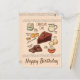 Tarjeta de Cumpleaños Receta de Tarta de Chocolate - Una lista de ingredientes dibujada a mano con belleza adorna la parte frontal de esta tarjeta con Feliz Cumpleaños en la parte inferior. La parte trasera de la tarjeta tiene un pequeño borde y el mismo color que la parte frontal.