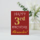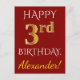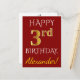 Este sencillo y personalizado diseño de postal de cumpleaños incluye el mensaje "FELIZ 3er CUMPLEAÑOS", mientras que el "3er" tiene una apariencia falsa de oro. En la parte delantera también hay un nombre personalizado y un fondo rojo. En la parte posterior aparece un mensaje de bienvenida de cumpleaños de personalizable, junto con la dirección de personalizable del destinatario de la tarjeta postal de cumpleaños. Se podría mandar a alguien que esté celebrando su tercer cumpleaños. [~Z0000071]