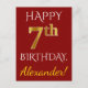 Este sencillo y personalizado diseño de postal de cumpleaños incluye el mensaje "FELIZ 7º CUMPLEAÑOS", mientras que el "7º" tiene una apariencia falsa de oro. En la parte delantera también se incluye un nombre personalizado y un fondo rojo. En la parte posterior aparece un mensaje de bienvenida de cumpleaños de personalizable, junto con la dirección de personalizable del destinatario de la tarjeta postal de cumpleaños. Se podría mandar a alguien que esté celebrando su séptimo cumpleaños. [~Z0000071]