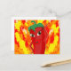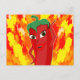 Caricatura de pimienta roja y caliente. Diseño original. Llamas de fuego en el fondo. Postales personalizados. La idea de la decoración de regalo para los amantes de la comida picante.