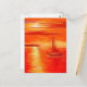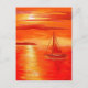 Pintura de aceite de una pareja que navegaba en un barco de vela contra una puesta de sol caliente y roja. Imagen disponible en varios regalos y productos. Postales.