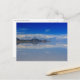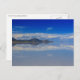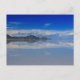 Llanuras salinas de Uyuni en Bolivia, con horizonte y montaña reflejadas en las llanuras cubiertas de agua.