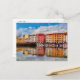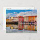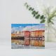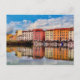 Postal de una vista panorámica de reflexiones en el agua de una colorida hilera de casas y botes en los canales Medici del barrio de Venezia Nuova en Livorno. Livorno está situado en la costa occidental de la Toscana, Italia. Fotografía digital y pintura digital de Sue Melvin