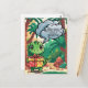 Un adorable bebé dinosaurio presentando un regalo al niño que cumple años en una selva prehistórica. Esta es una encantadora tarjeta de felicitación de cumpleaños para niños pequeños a los que les gustan las criaturas fantásticas y los dinosaurios.