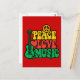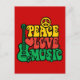 Diseño de tipo PEACE, LOVE & MUSIC con guitarra, símbolo de paz, notas de corazón y musicales en amarillo, rojo y verde.