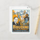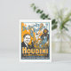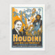 Esta postal es una reproducción de un anuncio de litografía vintage para el famoso mago Houdini. El poster afirma: "¿Regresan los espíritus? Houdini dice que no —y lo prueba" y promete "magia, ilusiones, escapes = medios de fraude expuestos".
